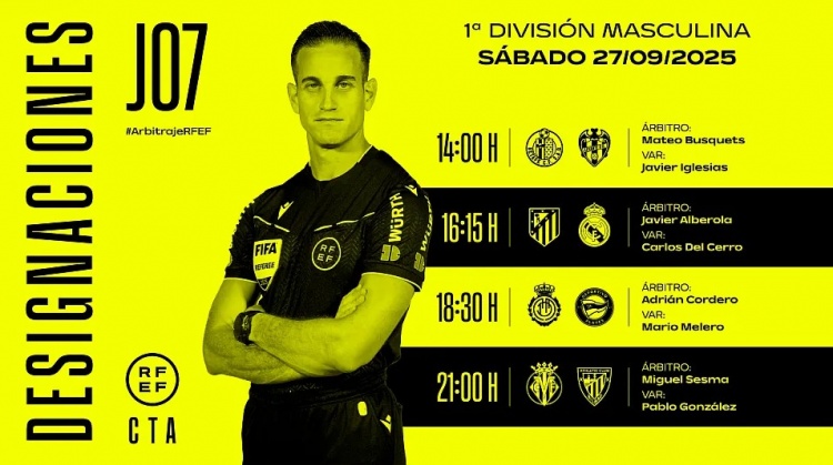 9月26日讯 西班牙足协官方公布了西甲联赛第7轮部分场次的裁判安排,其中,执法马德里德比焦点战的是哈维尔-阿贝罗拉-罗哈斯。