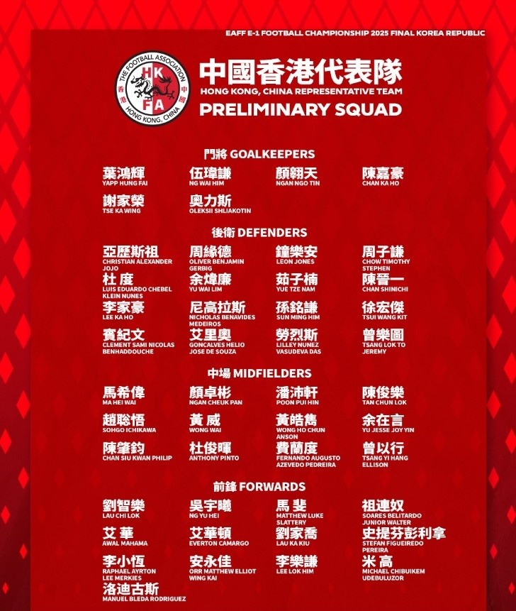 6月17日,中国香港足总公布了东亚杯47人初选名单,但26人名单尚未公布,主要是中超和中甲还在进行,名单中包括了8名效力中超,2名效力中甲的球员,必须考虑到可能的伤病。