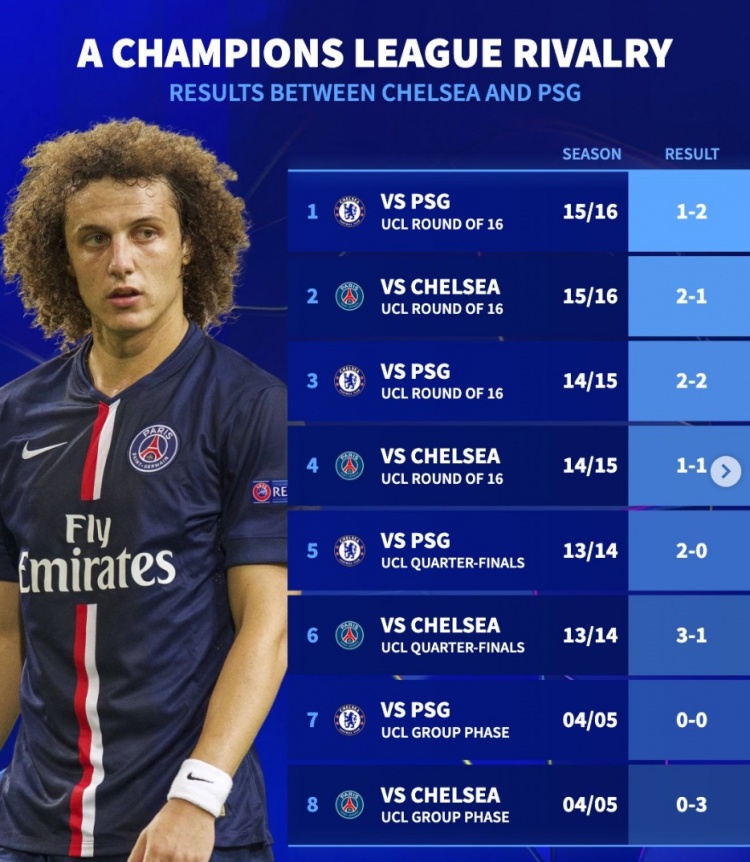 15-16赛季欧冠16强战:切尔西1-2巴黎、巴黎2-1切尔西(巴黎总比分4-2晋级)