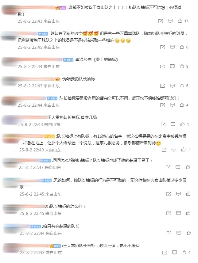 看到王大雷扔袖标的举动,山东泰山的球迷感到难以理解。在球队的官博评论区,球迷留言表达了对王大雷的不满,并希望俱乐部方面做出处理。