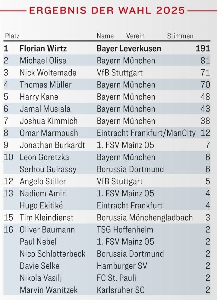 德国足球先生得票:维尔茨191票断层居首,奥利塞次席&穆勒第四