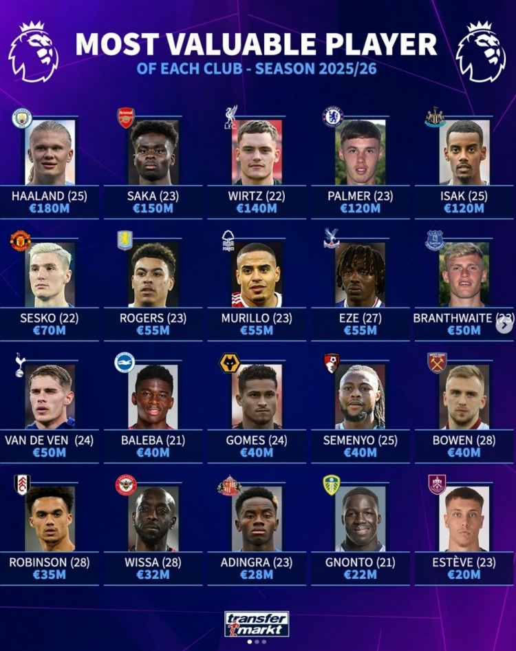 8月17日讯 新赛季英超已经开幕,德转也盘点了英超20支球队中身价最高的球员,其中哈兰德1.8亿欧领衔,具体如下: