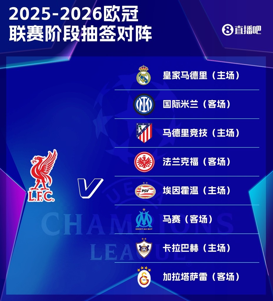 08月30日讯 欧足联官方公布了2025/26赛季欧冠联赛阶段的完整赛程,利物浦的联赛阶段赛程如下。