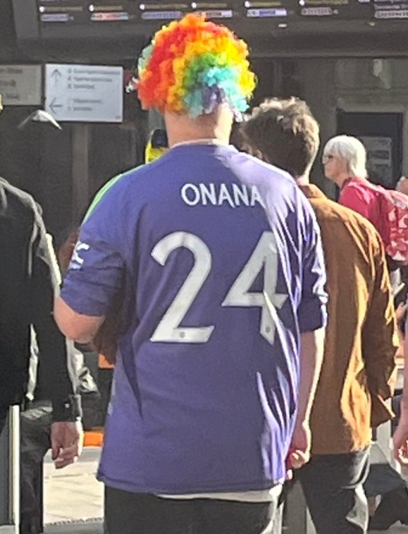 曼联跟队记者晒球迷穿奥纳纳球衣,该球迷还戴了顶小丑假发