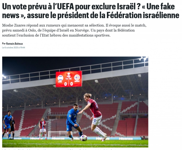 10月07日讯 北京时间10月12日星期日,世预赛欧洲区小组赛I组第7轮,挪威坐镇主场迎战以色列。在这场比赛之前,针对有计划在欧足联进行投票以排除以色列的报道,法国媒体巴黎人报表示,以色列足协主席做出了回应称这是假新闻。